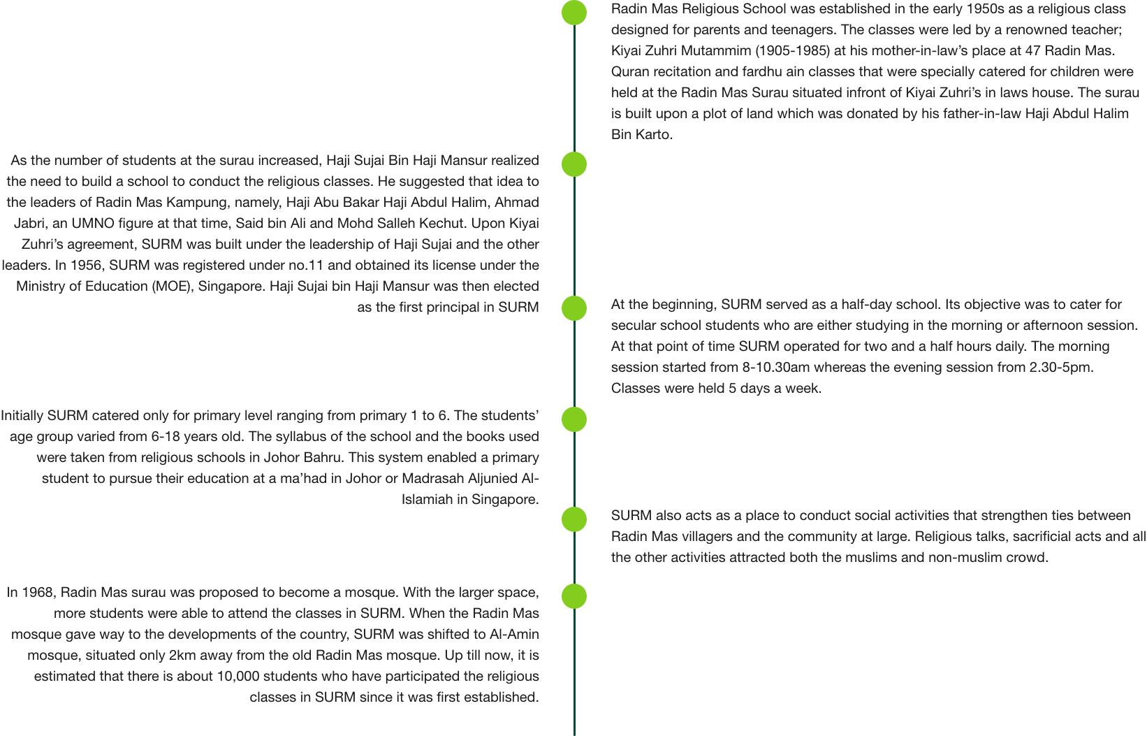 Sekolah Ugama Radin Mas (SURM) is the first full-time tahfiz madrasah in Singapore. SURM offers a holistic education curriculum that focuses on Quran memorisation for secondary level students.